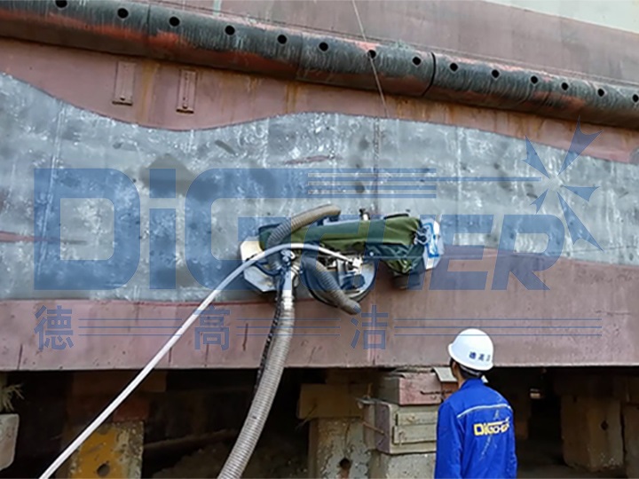 另外值得一提的是,德高潔超高壓水除銹爬壁機器人無需借助任何輔助支撐機械可以攜帶200kg負載,可以搭載超高壓水清洗機構、噴涂或噴砂工具,實現除漆和再噴涂同步作業。