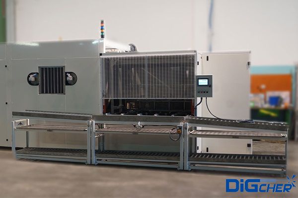 PT-6 SSDA 大軸承通過式清洗線采用動力輥子輸送上料,網帶帶動工件一次進入噴淋清洗工位、噴淋漂洗工位、烘干工位及霧化上油工位。采用知名品牌PLC實現清洗過程全自動準確控制,可變頻調速。