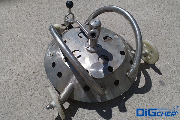 空化射流拋光器由兩個旋轉(zhuǎn)噴嘴帶動打磨盤,在清洗的同時,對螺旋槳進(jìn)行拋光打磨,使其表面光滑潔凈,光滑的表面減少了海生物的附著。旋轉(zhuǎn)噴嘴外由整流罩包圍,空化現(xiàn)象能使打磨拋光盤與被清理面產(chǎn)生負(fù)壓提供吸力,設(shè)備可緊貼表面進(jìn)行工作。